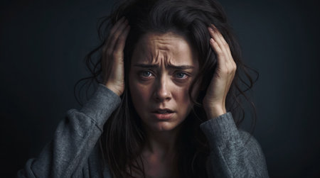 Close-up portrait of a woman with curly hair, displaying emotions of stress and anxiety. She holds her head in hands against a neutral backdrop, illustrating vulnerability.