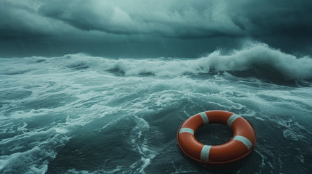 Lifebuoy floats in rough sea waters. Safety and rescue concept. Generative AI