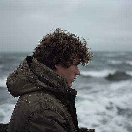 Young Person Contemplating by Stormy Ocean Shoreline on Gloomy Day