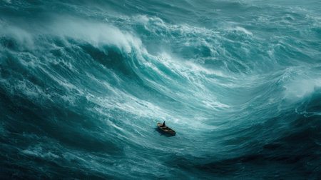 A lone surfer skillfully maneuvers a small boat through towering ocean waves as stormy weather creates dramatic conditions at dusk. Intense waves crash all around, showcasing natures power.