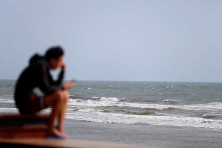 Sad young man silhouette worried on the beach with the sea and blue sky in the background. Vung Tau. Vietnam.