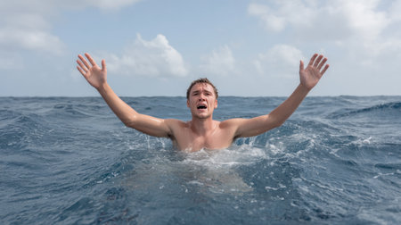 The concept of tragedy takes a poignant form in this image, where a man's scream desperate pierces through the splashing waves as he struggles against drowning in the sea.