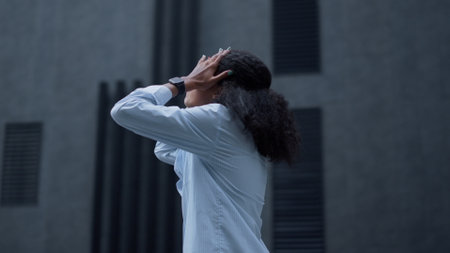 Stressed businesswoman crying outdoors portrait. Unhappy frustrated woman expressing anger standing at modern office. Upset african american manager disappointed about bad news. Emotional breakdown.