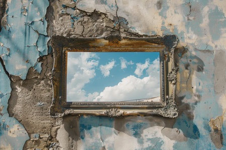 Antique frame reflects a clear blue sky on a weathered wall with peeling paint