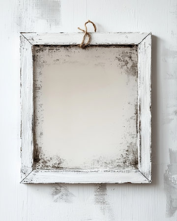 A rustic, distressed white wooden frame hangs by a twine loop against a textured white wall, creating a vintage, decorative display.