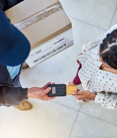 For your convenience. High angle shot of an unrecognizable delivery man receiving payment from a female customer for her order.