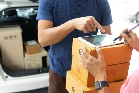 Woman customer appending signature in digital tablet and receiving a cardboard boxes parcel from delivery service courier, Home delivery service and working with service mind.