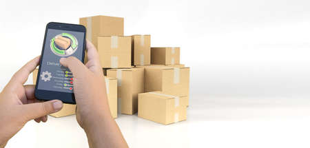 3D rendering of a smartphone delivery tracking app packages on the background
