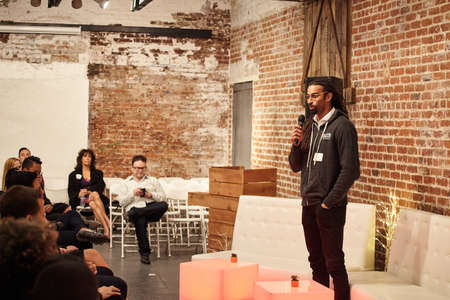 LOS ANGELES, UNITED STATES - Feb 09, 2019: Rashad Johnson of Eaze, a cannabis delivery service, speaking at Weedweek REcharge LA, a cannabis industry conference.