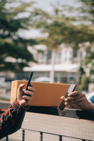 Woman hand accepting a delivery of boxes from deliveryman. Home delivery courier service and shipment concept