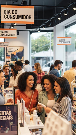 Individuals are shown using touch screen displays and a mobile phone within a bright, contemporary retail environment. The scene involves multiple people, possibly customers and employees, engaging with technology. This image could be used for articles, websites, or marketing materials related to retail, technology, or consumer behavior.