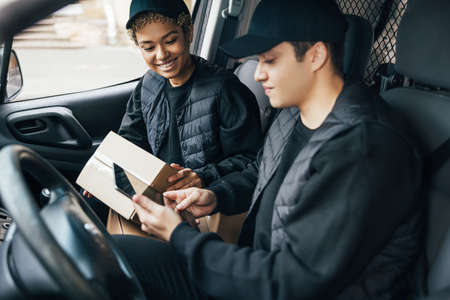 Two couriers in uniform sitting in a van checking delivery information on a digital tablet