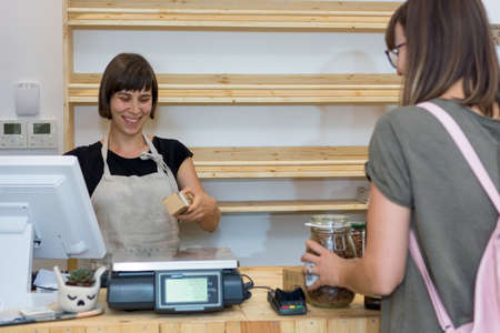 Customers buying dry goods and bulk products in plastic-free grocery stores. Conscious shopping, sustainable small businesses, minimalist lifestyle