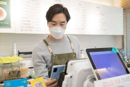 Asian male entrepreneur, store owner with mask, business concept