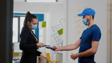 Businesswoman with face mask receiving takeaway food lunch order paying with smartphone using POS contactless service. Delivery man with gloves against covid19 bringing fresh lunch at office workplace