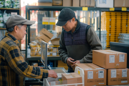 Two Asian owners, entrepreneurs, are standing in a warehouse, examining boxes carefully.