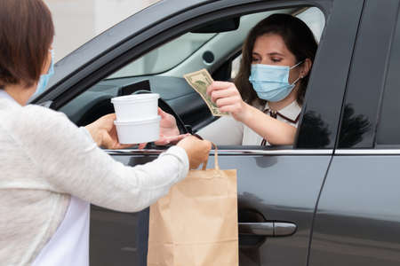 Businesswoman in a car buying takeaway food and paying for it