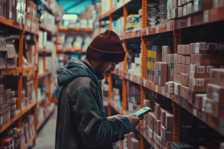 A candid shot of a worker scanning barcodes on packaged books, surrounded by shelves, emphasizing the attention to detail required in inventory management. --ar 3:2 --v 6 Job ID: 8a7fe05c-4b76-4b22-9474-4efdc339b867