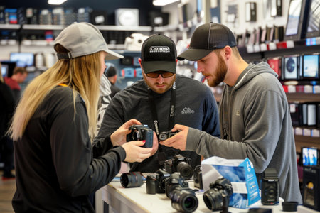 An engaging photograph of staff assisting customers in a camera store, capturing the interaction and expertise involved in the wholesaling environment. --ar 16:9 --v 6 Job ID: c1d56757-19a5-497d-b175-90efaab1944c