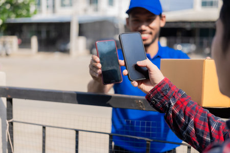Asian Young delivery man courier shopping online with package post box in uniform he protective face mask he making service and customer using hand finger signature on digital mobile phone at home