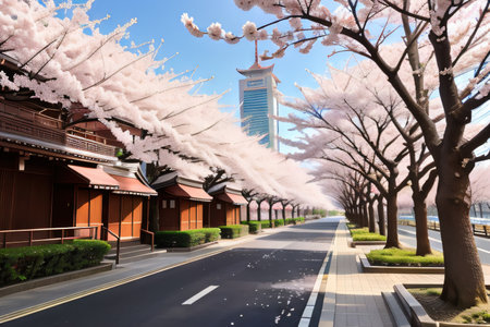cherry blossom-lined street, with view of bustling city, created with generative ai