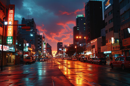 View of cityscape at night with colorful advertisement billboard light beside the street in Shinjuku district at night in Tokyo, Japan.