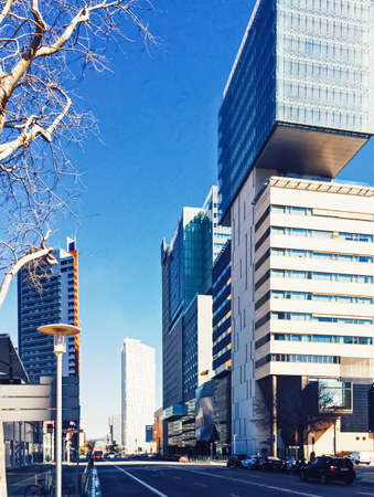 Barcelona, Spain circa April, 2020: Modern buildings and the city center street of Barcelona in Spain