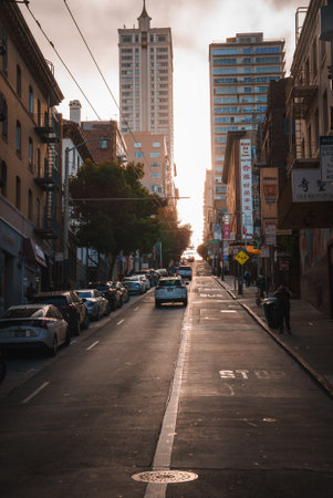 San Francisco street scene at dawn or dusk, cars parked, Asian signs, serene atmosphere