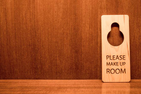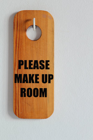 Please make up room wooden sign hanging on white concrete wall.