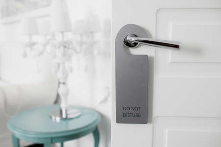 Closed white door of hotel room with please do not disturb sign