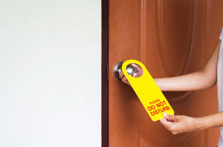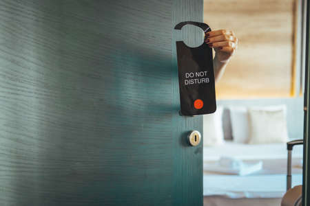 Woman hands holding please do not disturb sign in hotel room