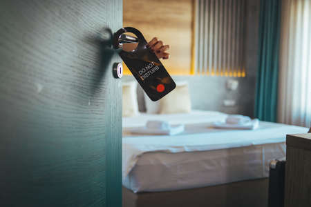 The hotel room with DO NOT DISTURB sign on the door