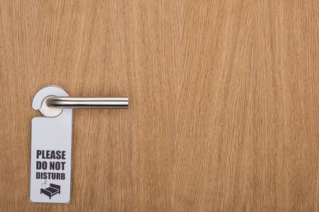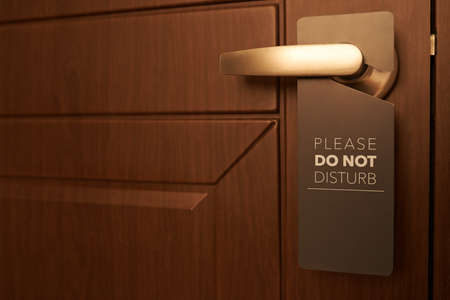 Closed door with please do not disturb sign on handle of hotel room