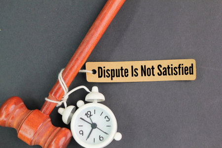 bell clock, judge's gavel and a paper tag with the words dispute is not satisfied