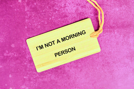 A light yellow tag rests on a textured, bright pink surface. The tag declares, Im NOT A MORNING PERSON in bold, black capital letters. Its attached with a yellow string.