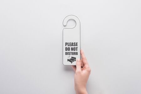 cropped view of woman holding please do no disturb sign on white background