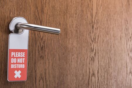 wooden hotel room door with please do no disturb sign, panoramic shot
