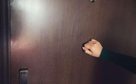 young woman knocking at hotel door