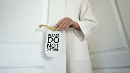 Unrecognizable woman in a white house coat hangs a sign on the door Do not disturb