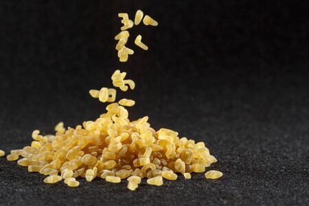 Scattered cavatappi uncooked golden wheat curly pasta on textured dark black background, angle view macro