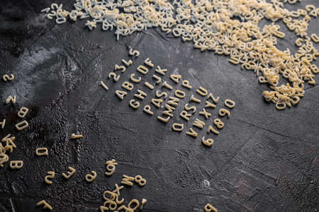 Pasta we love you sign formed of Italian letter shaped pasta product on the black concrete background.