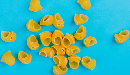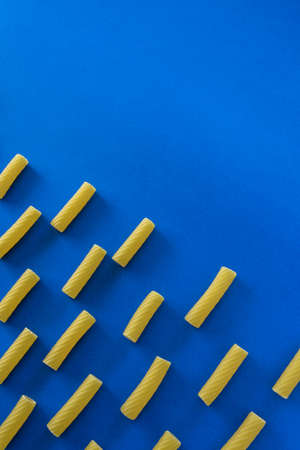 Colored pasta composition on blue background. Flat lay, layout and tabletop mockup.