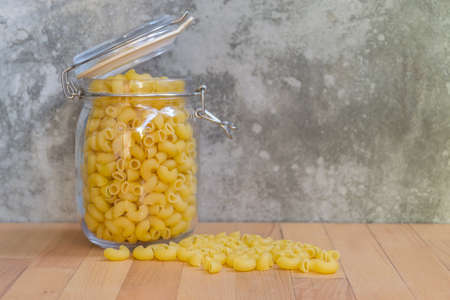 Close-up of Uncooked Macaroni in a glass jar placed on the wooden table background, selective focus.