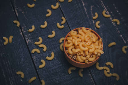 Brown wooden bowl or pot with pasta or raw macaroni on black wooden background, copy space. Carbohydrates diet, healthy eating habits and vegetarian food concept.