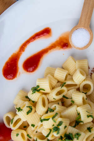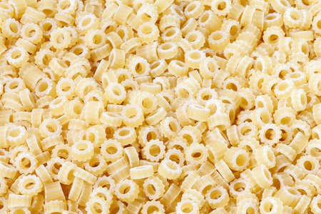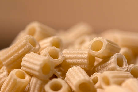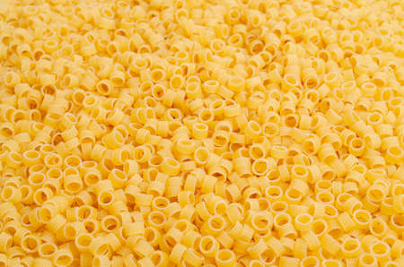 Texture of the dry pasta Ditalini. Italian traditional food. Variety of pasta. View from above.