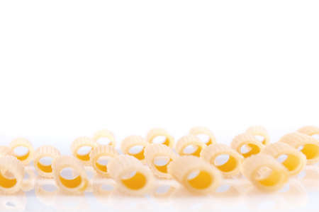 Raw feathers macaroni. Italian pasta close-up on the white background.