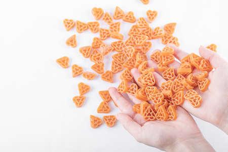 Multicolored pasta scattered on a white background. Top view. Copy, empty space for text.