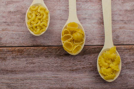 Dried pasta food selection in wooden spoons over old oak background. Copy space for text