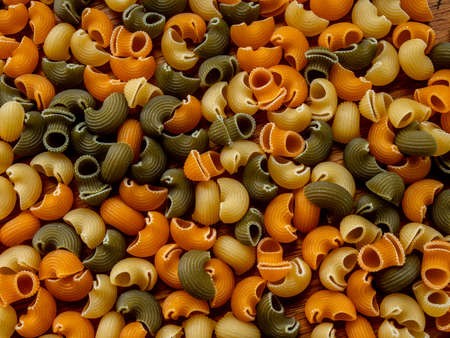 Bunch of Italian green multicolored pasta with tomato and basil flavor, top view