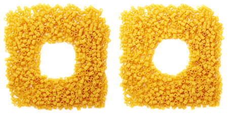 Square frame made of dry ditalini yellow pasta over isolated white background